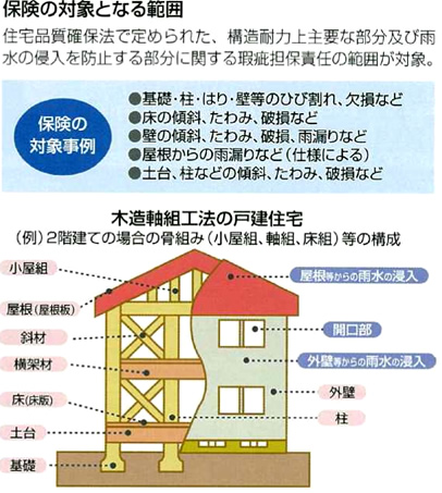 ●住宅の「構造耐力上、主要な部分」と「雨水の侵入を防止する部分」に瑕疵(欠陥)が見つかった場合には、住宅の引渡しから10年間は補修費用等に伴う保険金をお支払いする補償体制をとっています。